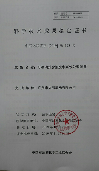 2019年11月11日,由廣州市人和清洗有限公司自主設計開發的“可移動式含油廢水高效處理裝置”項目,順利通過由中國石油和化學工業聯合會在北京組織的科技成果鑒定。在鑒定會上,專家們一致認為:該成果整體處于國內領先水平,填補了國內小微企業含油廢水原位高效處理的空白,同意通過鑒定。